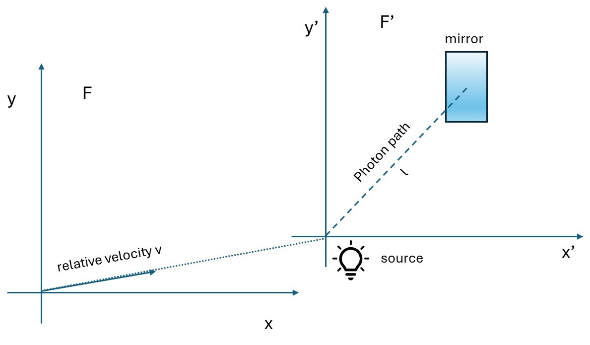 where l is the distance of the mirror from the source measured from F, and c1 is the photon velocity in F′ as observed in F. When the photon reaches the mirror its position will be